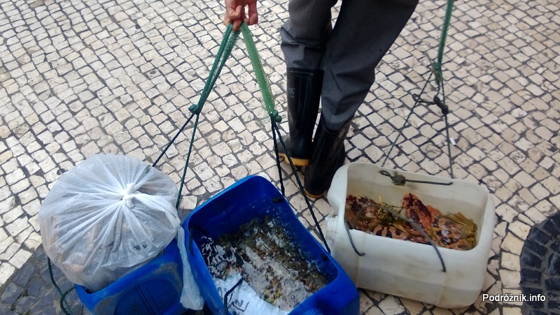 Chiny - Makao - mężczyzna ciągnie pojemniki ze świeżymi owocami morza - kwiecień 2013