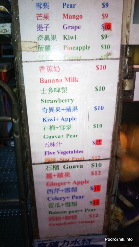 Chiny - Hongkong - cennik świeżych soków i koktajli - kwiecień 2013
