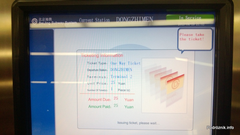 Chiny – Pekin – dworzec kolejowy Dongzhimen – ekran automatu do sprzedaży biletów na Airport Express – kwiecień 2013
