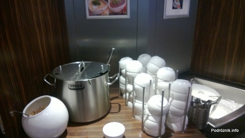 Holandia – Lotnisko w Amsterdamie – Amsterdam Airport Schiphol – KLM Crown Lounge – garnek z zupą i misa z grzankami – kwiecień 2013