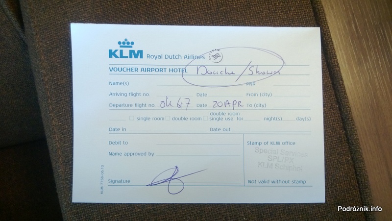 Holandia – Lotnisko w Amsterdamie – Amsterdam Airport Schiphol – KLM Crown Lounge – voucher na prysznic w lotniskowym hotelu – kwiecień 2013