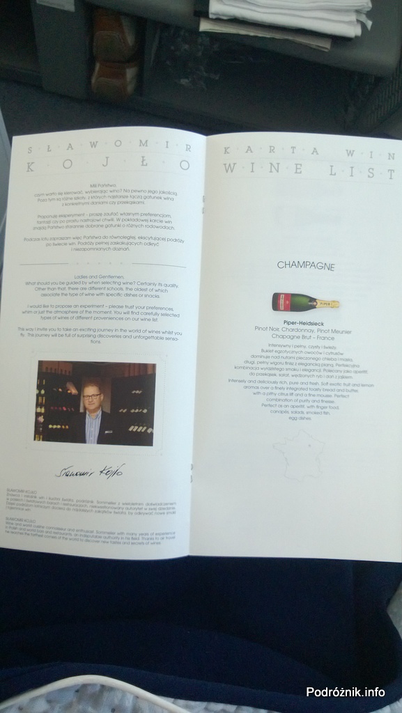 Polskie Linie Lotnicze LOT – Boeing 787 Dreamliner (SP-LRA) – Klasa Biznes (Elite Club) – menu – karta win – sommelier Sławomir Kojło i szampan – czerwiec 2013